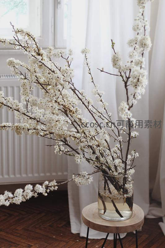 阳光透过窗户洒在铺有鱼骨纹木地板的房间,玻璃瓶中盛放的白色樱花枝条优雅伸展,与背景的白色窗帘共同构成一幅恬静家居画卷。