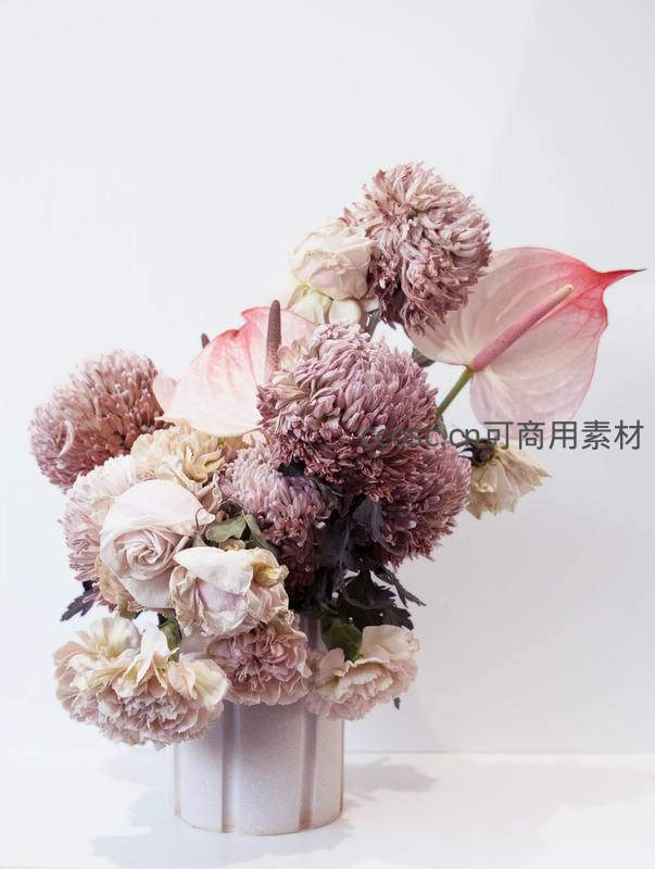 一个米白色竖条纹花瓶中盛放着一束由粉色玫瑰、紫色绣球和红掌组成的干花花束,色彩柔和统一,在纯白背景下显得格外雅致与高级。