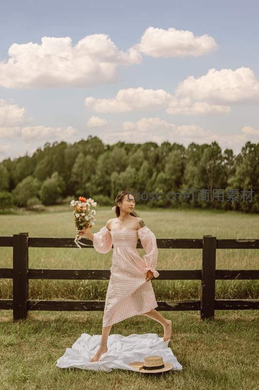 一位身穿粉色格子连衣裙的少女在广阔的绿色草地上奔跑,手中紧握一束野花,身后是黑色木栅栏和蓝天白云,洋溢着自由与青春的气息。