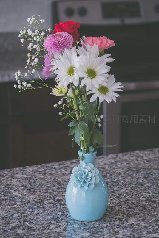 一个淡蓝色陶瓷花瓶置于厨房大理石台面上,插着白雏菊、粉康乃馨、红玫瑰等多彩鲜花,为居家空间增添自然与温馨感。