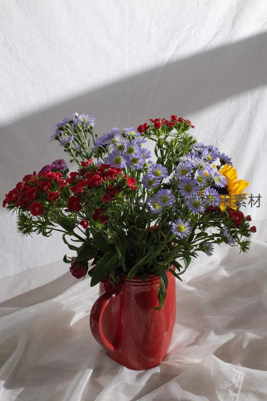 一只鲜红色陶瓷水壶中插满紫、红、黄等各色野花,置于白色布幔之上,阳光斜射形成柔和阴影,呈现自然与生活的和谐之美。