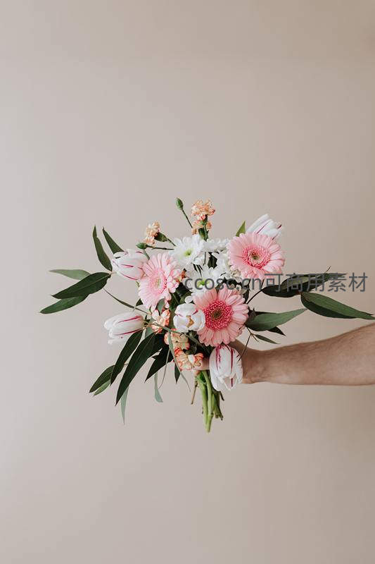 一只手臂托举着一束色彩柔和的鲜花,包含粉色非洲菊、白红条纹郁金香及绿叶,构图简洁,传递出温暖与美好的居家氛围。