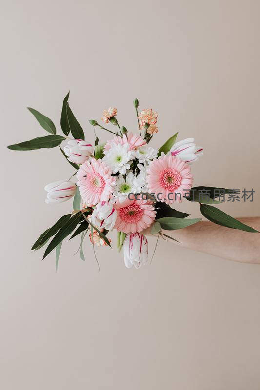 近距离拍摄的手持花束,以粉色非洲菊和白红条纹郁金香为主角,配以深绿叶片,色彩和谐,适合用于节日或家居装饰场景。