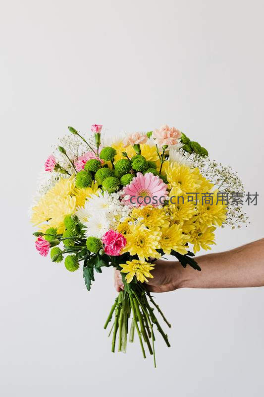 一只手稳稳托住一束色彩斑斓的鲜花,包含黄菊、粉雏菊、白满天星和绿绣球,构图饱满,象征喜悦与祝福,适合节日或送礼场景。