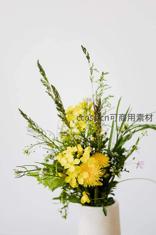 一束采自田野的黄色小花与细长青草插在素雅白瓷瓶中,形态自由不羁,背景纯净,传递出回归自然、质朴清新的生活美学。