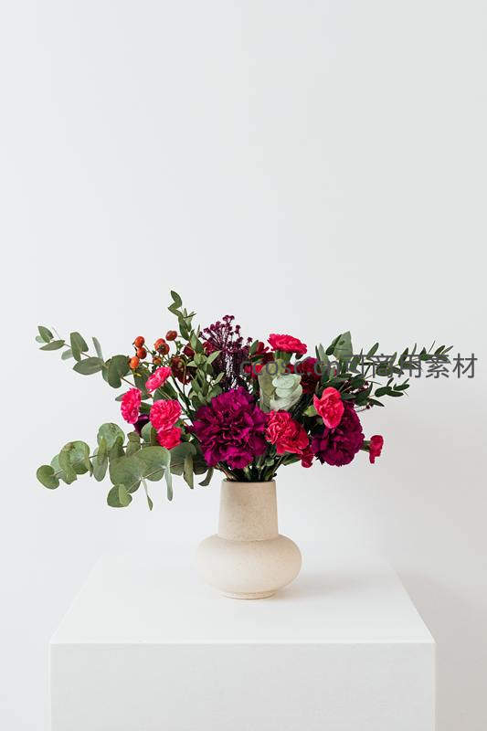 一束由深红色与紫色康乃馨、绿色尤加利叶组成的精致花艺,置于米色陶制花瓶中,摆放在纯白立方体台面上,整体构图简洁,色彩浓郁而和谐。