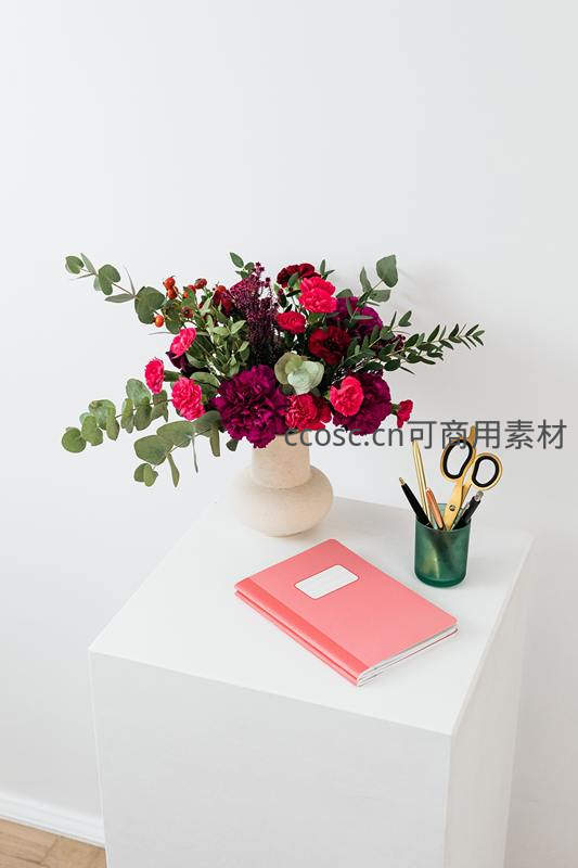 白色方桌上摆放着一束鲜艳的花束、一本粉色封面的笔记本和一个装有金色剪刀与铅笔的绿色笔筒,营造出兼具效率与美感的现代办公或学习空间。