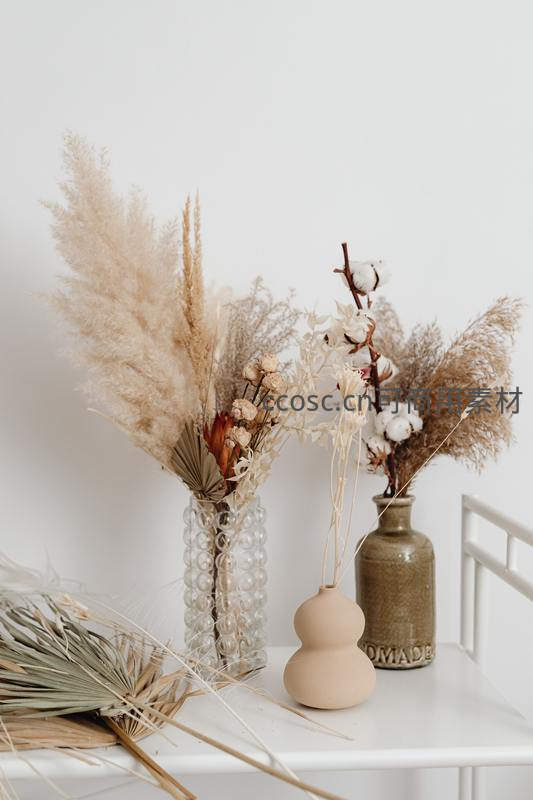 白色桌面上摆放多款干花与不同质感花瓶,包括蓬松芦苇、洁白棉花和复古陶罐,呈现极简而富有层次的室内装饰艺术。