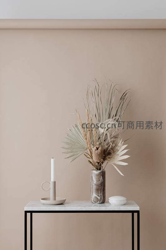 浅棕墙面下,大理石台面摆放干花瓶、白色蜡烛与陶瓷器皿,线条简洁、色调柔和,打造高雅现代感的入户空间装饰。