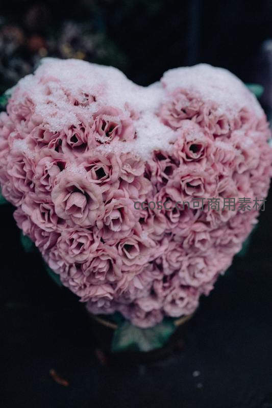 由无数粉色小玫瑰精心扎成的心形花束,顶部覆盖着一层薄薄白雪,在暗色背景下更显柔美与浪漫,是情人节或冬日主题中极具视觉冲击力的花艺作品。