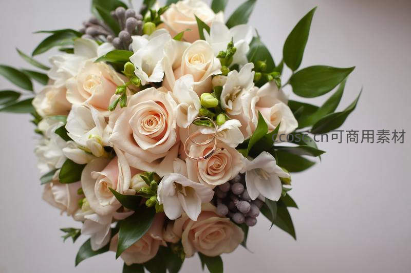 一束由浅粉玫瑰、白色小花和绿叶组成的精致婚礼捧花,中央点缀着一对金色婚戒,象征爱情的永恒与美好。