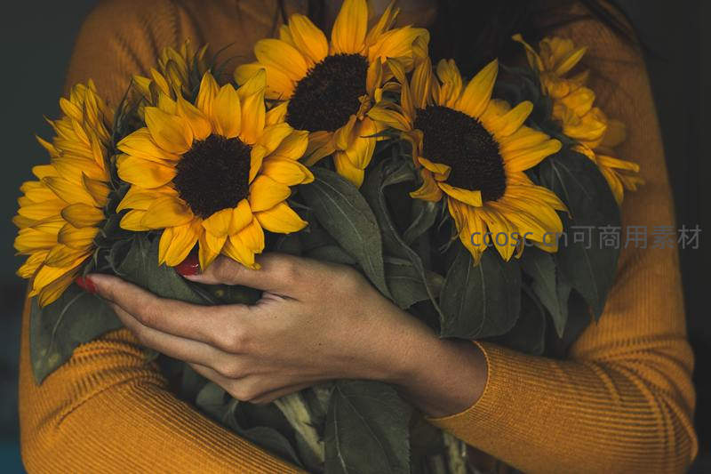 女子怀抱金黄向日葵花束