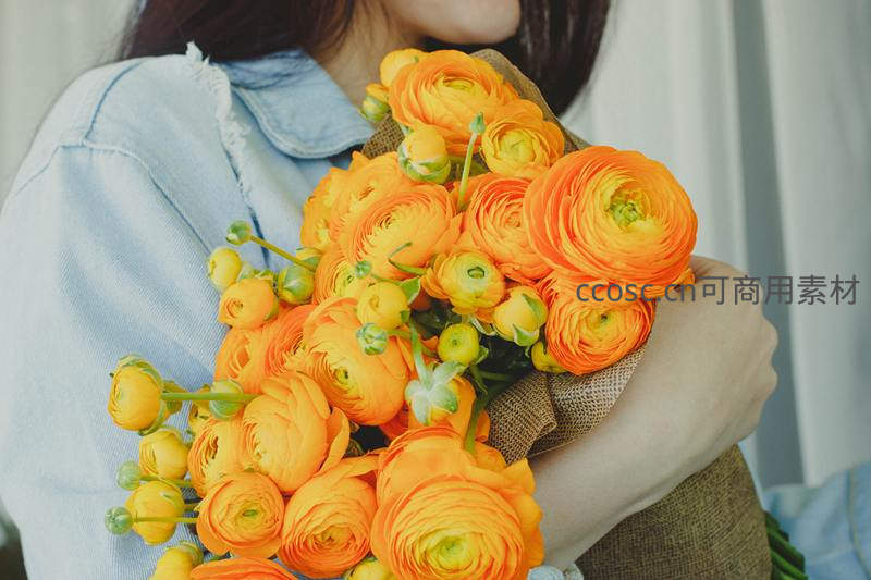 一位女士轻柔地抱着一束盛开的橙色毛茛花,花朵鲜艳夺目,与她浅蓝色牛仔衣形成柔和对比,传递出春日的温暖与宁静。