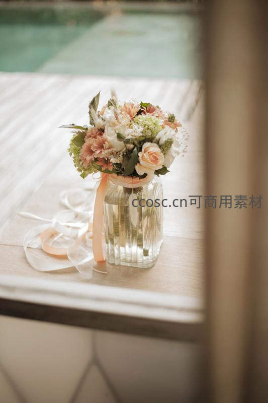 一束淡粉色与白色相间的婚礼捧花置于透明玻璃瓶中,摆放在木质桌面上,背景是模糊的泳池水波,整体画面温柔浪漫,充满仪式感。