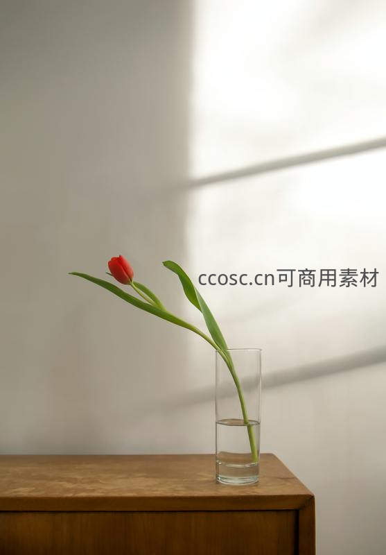 一支鲜艳的红色郁金香插在透明玻璃杯中,静静立于原木色柜子上,柔和光线从侧面洒落,勾勒出简洁线条与宁静美感。