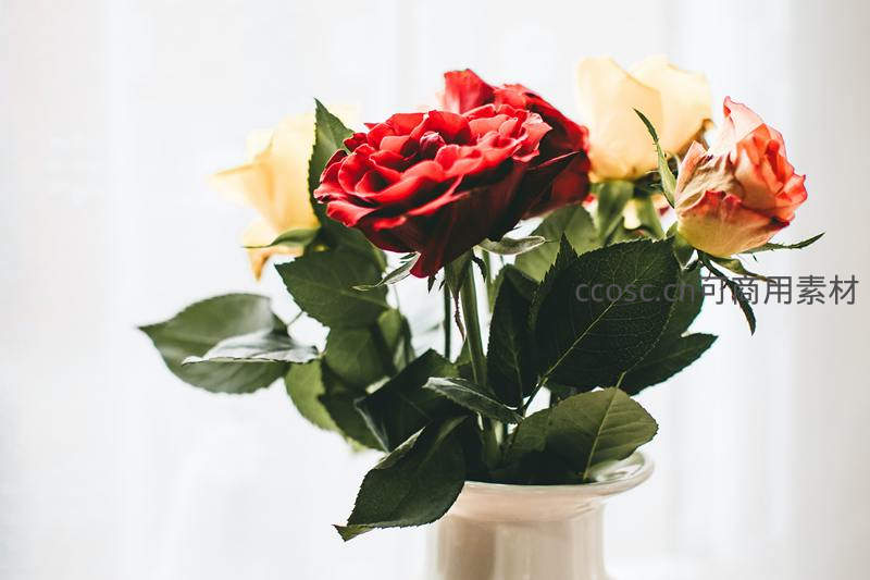一束红黄相间的玫瑰插在白色花瓶中,置于明亮窗前,柔和光线洒落,绿叶衬托花朵,营造宁静而温馨的家居角落。