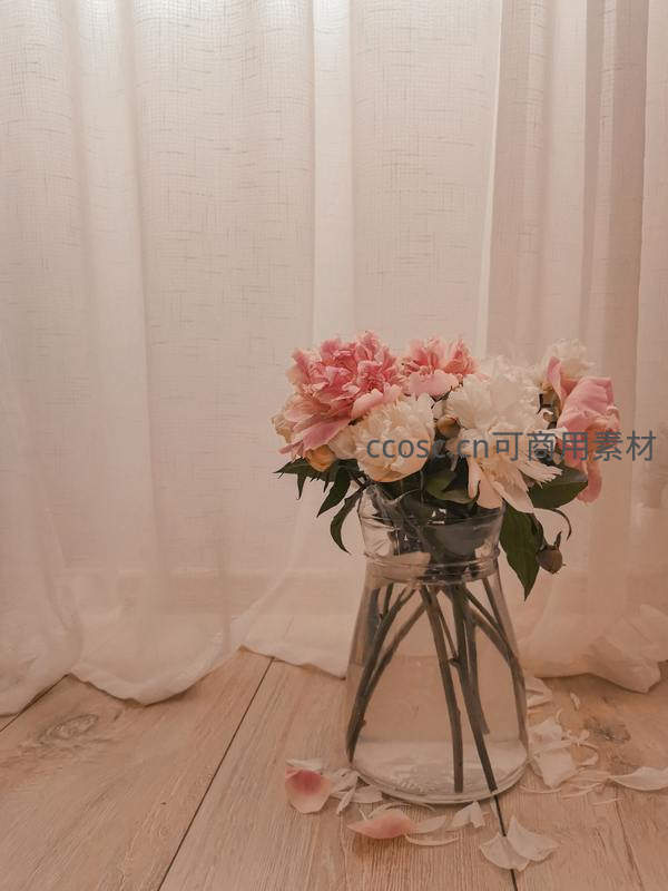 一束粉白相间的牡丹花插在透明玻璃花瓶里,散落的花瓣点缀在木地板上,背景是轻柔的白色纱帘,营造出温馨宁静的家居氛围。
