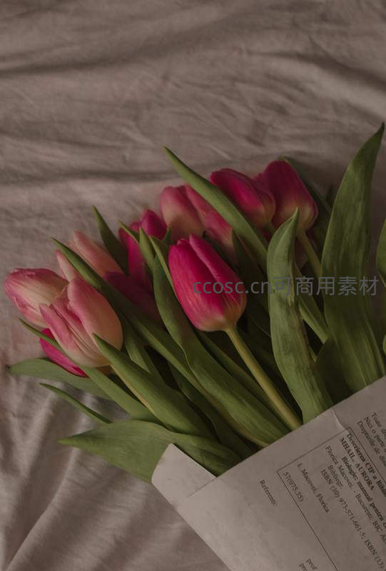 一束鲜艳的粉红色郁金香整齐地躺在褶皱的米色床单上,绿叶衬托花朵,纸质包装一角露出,整体画面充满温柔与生活气息。