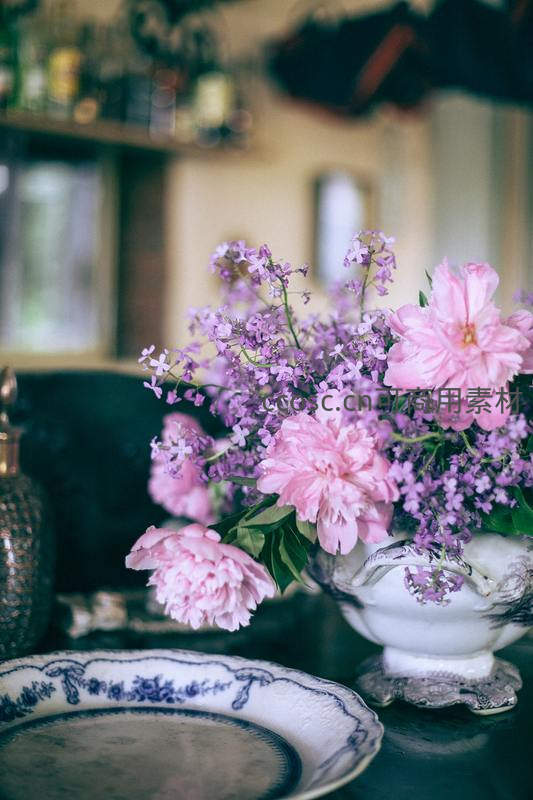 粉紫花束静置古雅瓷瓶,温馨家居一角