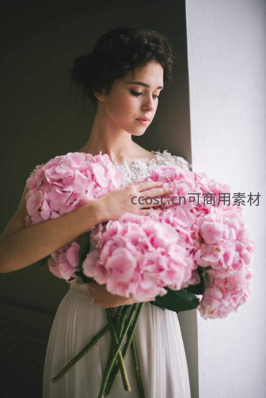 一位身穿白色礼服的新娘,低头轻抚怀中大捧粉色绣球花,柔和光线洒落,营造出浪漫宁静的氛围。