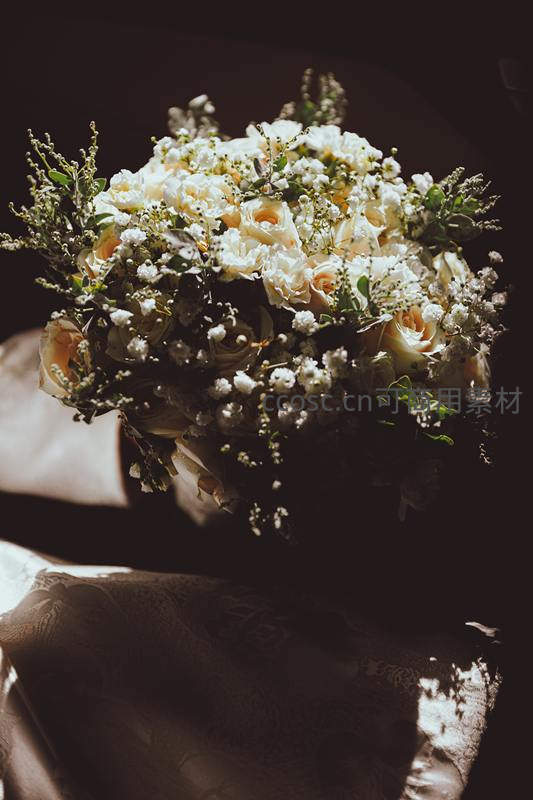 一束由白色与浅黄玫瑰组成的婚礼花束,在明暗对比强烈的光线下显得格外纯净优雅,背景虚化突出了花朵的柔美质感。