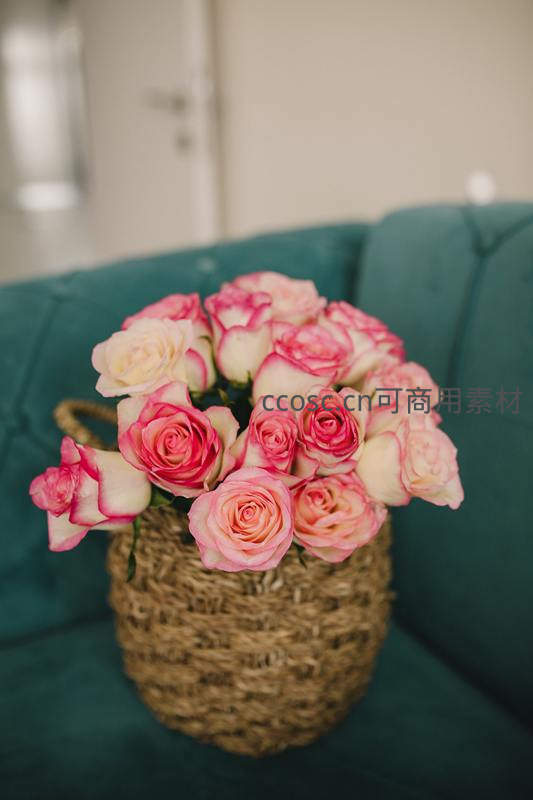 一篮盛开的粉白渐变玫瑰放置在墨绿色绒布沙发上,自然光线洒落,为现代家居空间增添一抹温馨与浪漫的装饰氛围。