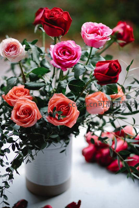 多种颜色的玫瑰在白色花瓶中绽放,背景柔和模糊,突显花朵层次与色彩,充满生机与浪漫气息。