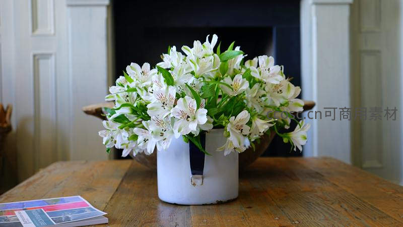 一盆盛开的白色百合花放置在木质餐桌中央,背景是古典壁炉,整体画面宁静优雅,充满居家温馨感。