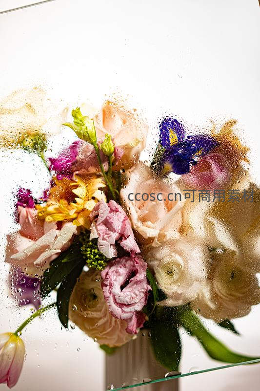 透过布满水珠的玻璃拍摄的花束,色彩斑斓却略带朦胧,营造梦幻唯美的视觉效果,富有艺术表现力。