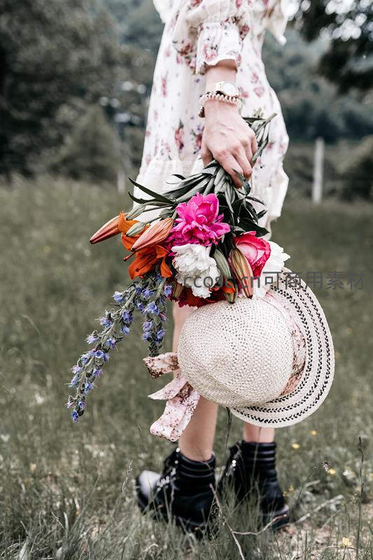一位身着碎花裙的女子在绿野中手持缤纷花束与编织草帽,展现悠闲惬意的田园生活美学,充满诗意与浪漫气息。