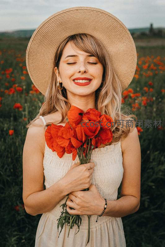 金发女子闭眼微笑伫立于漫天红罂粟花海中,头戴宽檐草帽怀抱鲜花,享受阳光与自然带来的宁静与幸福感。