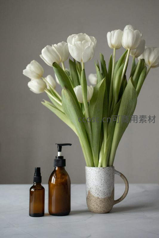 一束洁白的郁金香插在陶瓷杯中,旁置两支琥珀色玻璃瓶,整体构图简洁素雅,营造出宁静温馨的居家氛围。