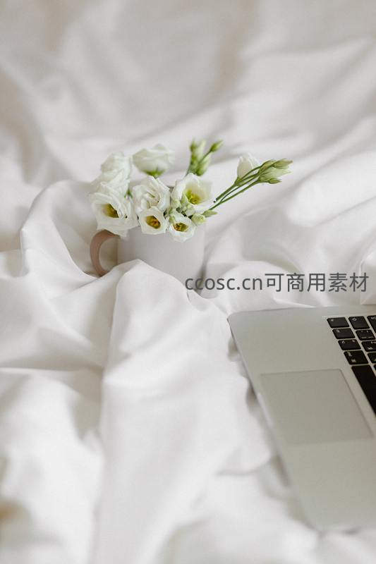 纯白床单上摆放着一杯白花和一台银色笔记本电脑,展现现代人悠闲居家办公或学习的惬意时光。