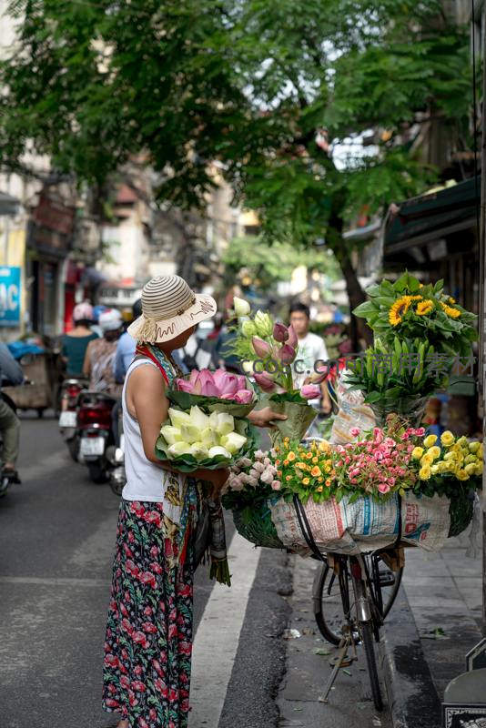 一位戴着草帽的花贩在繁忙的街道边整理着自行车上的各色鲜花,背景是充满生活气息的城市街景。