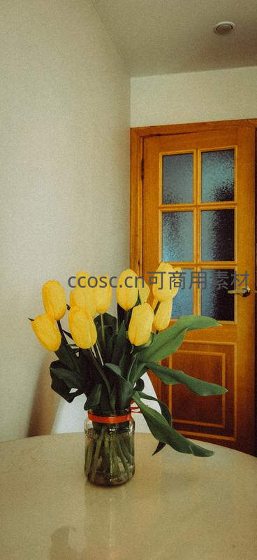 一束明艳的黄色郁金香插在玻璃罐里,安静地摆放在房间角落的桌上,木质门框和柔和光线增添了家的温暖感。