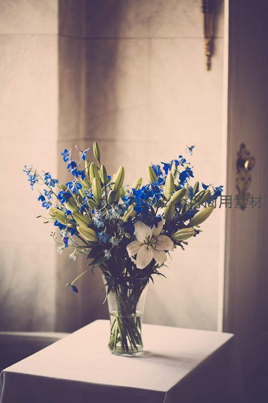 蓝白百合花束静置于古典窗台前