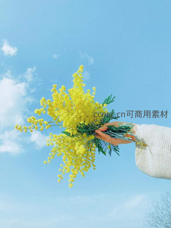 一只手举着一束盛开的金合欢花,花朵如绒球般蓬松,背景是清澈的蓝天白云,整体画面明亮清新,充满春日活力与自然之美。