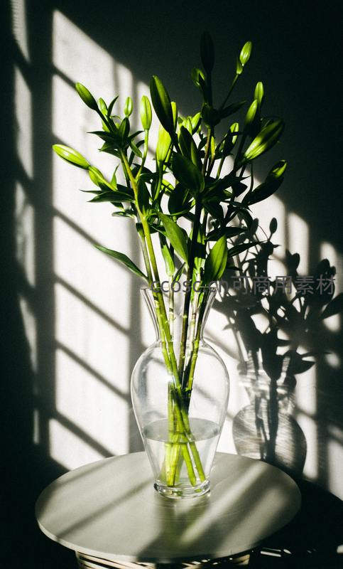 透明玻璃瓶中插着数支未绽放的绿色百合花苞,阳光透过百叶窗在墙面投下条纹光影,形成明暗对比,展现静谧而富有生命力的画面。