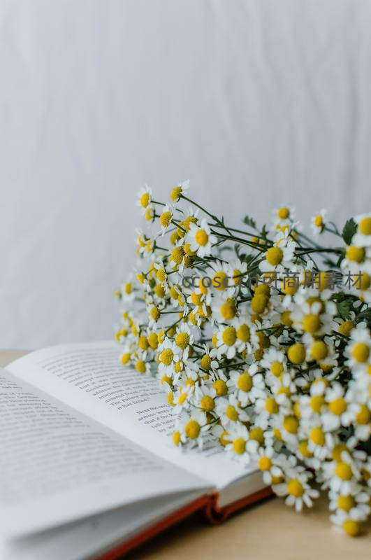 一束洁白的雏菊花枝轻搭在一本摊开的书页上,黄蕊白瓣在柔和光线下显得格外清新,营造出书香与自然交织的宁静文艺氛围。