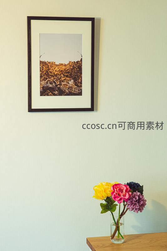 木质桌面上摆放着一束由黄、粉、紫三色玫瑰组成的插花,背景是素雅墙面与一幅秋叶挂画,整体空间显得宁静而富有艺术气息。