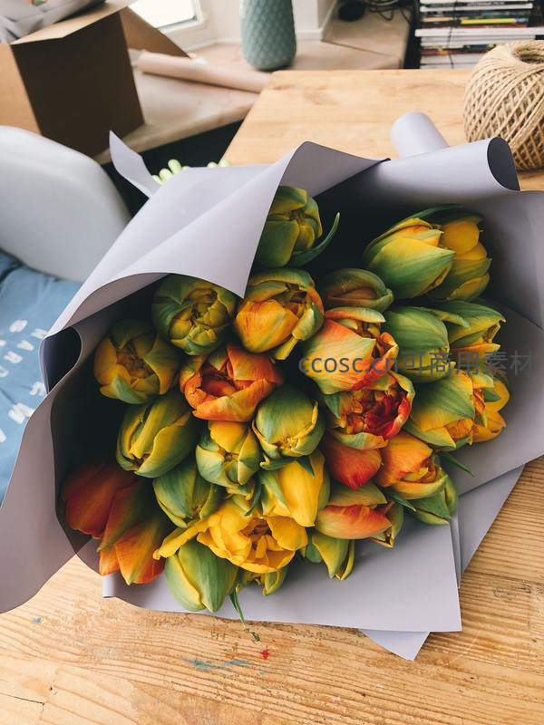 一束黄绿渐变色郁金香被浅灰纸包裹,置于木质桌面上,花瓣微卷,色彩鲜活,营造出春日清新自然的氛围。