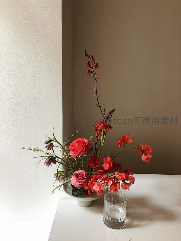 一束红粉玫瑰在素雅的室内角落静静绽放,搭配透明玻璃杯,柔和的自然光洒落,营造出温馨宁静的居家氛围。