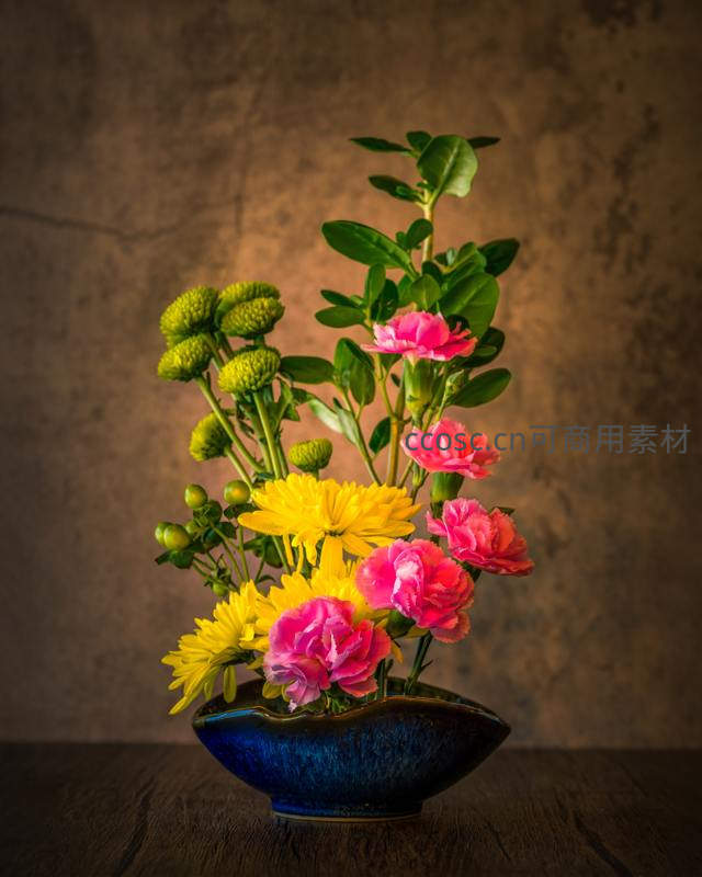 一只深蓝色釉面花器中盛放着明艳的黄色菊花、娇嫩的粉色康乃馨和青涩的绿色花苞,搭配翠绿枝叶,在暖光下生机盎然。