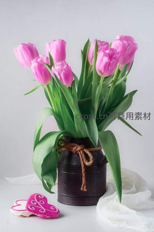 一束娇艳的粉色郁金香插在深色复古铁罐里,罐身系着麻绳,旁边放着两块心形糖霜饼干,整体画面清新温柔,充满生活仪式感。