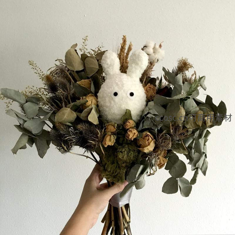 一束以尤加利叶和干花组成的花束中,巧妙嵌入一只白色毛绒小兔,增添童趣与温馨的装饰效果。
