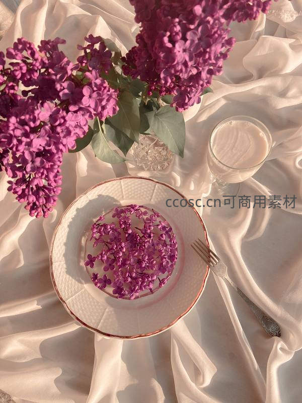一束盛开的紫丁香旁,精致的盘子里盛放着用花瓣装饰的甜点,搭配一杯饮品和银质叉子,营造出温柔浪漫的下午茶氛围。