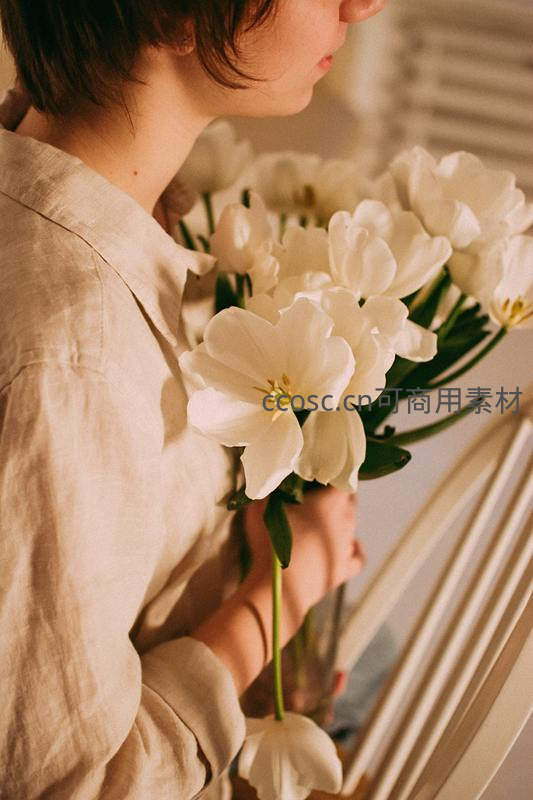 一位穿着浅色衬衫的女子侧身持握一束洁白郁金香,柔和光线洒落,营造宁静、优雅的生活氛围。
