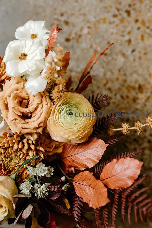 以橙棕为主色调的干花组合,包含玫瑰、银莲花与蕨类植物,散发温暖复古气息,适合作为室内陈列装饰。