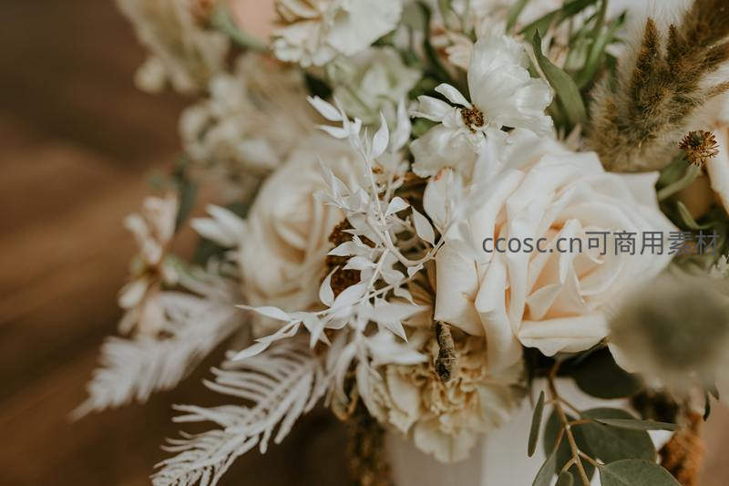 全白色调的干花与羽毛草相映成趣,营造出纯净梦幻的视觉效果,适合用于婚礼布置或摄影背景。