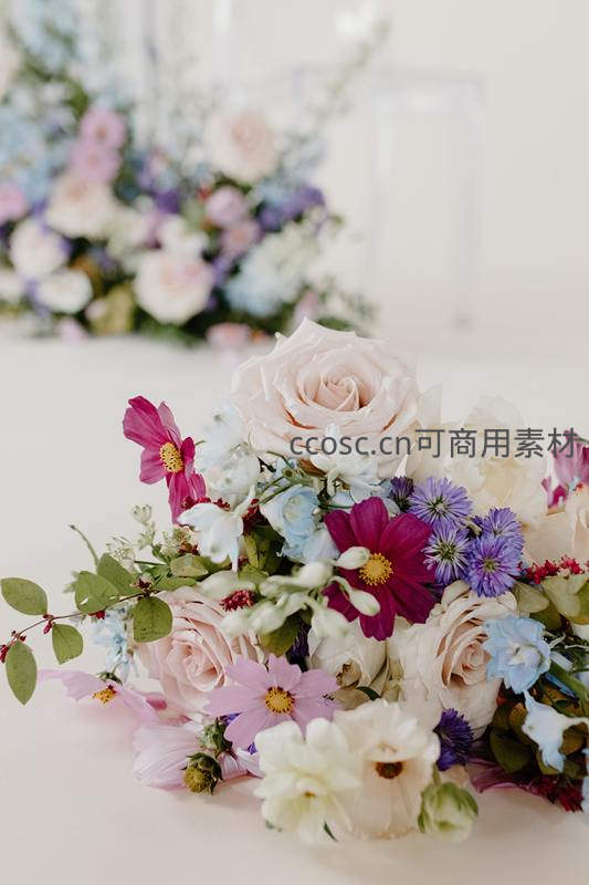 粉色玫瑰、紫色雏菊与白色小花交织成柔美花束,背景虚化突出主体,展现婚礼或庆典中精致的花艺细节。
